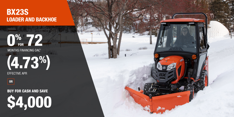 Discount shown available on a new and previously unregistered BX23S is $1,000.00. Offer cannot be applied on past transactions, and has no cash surrender value. Representative finance example for the BX23SLBB-T-1: $35,233.07 financed at 0% (3.05% effective APR which factors in $1,000.00 in stackable cash, plus $2,748.18 in non stackable cash that cannot be combined with finance offers) equals $203.27 bi-weekly for 72 months. 156 payments required bi-weekly for 72 months. $3,523.31 down payment required. Cost of borrowing is $2,748.18 for a total obligation of $35,233.07. Financing available on approved credit. Prices and payments include freight and other applicable fees (including environmental fees, administration fees, set-up fees, and dealer fees on the model specified). Rebate of $2,500 available on cash purchases of a new BX23S only. Offer valid until 03-31-2026.