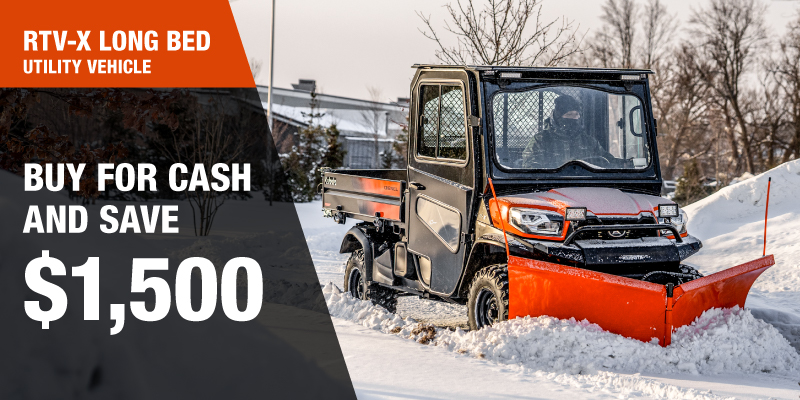 Rebate of $1,500.00 available on cash purchases of a new RTV-X Long Bed only. Offer valid until 03-31-2026.