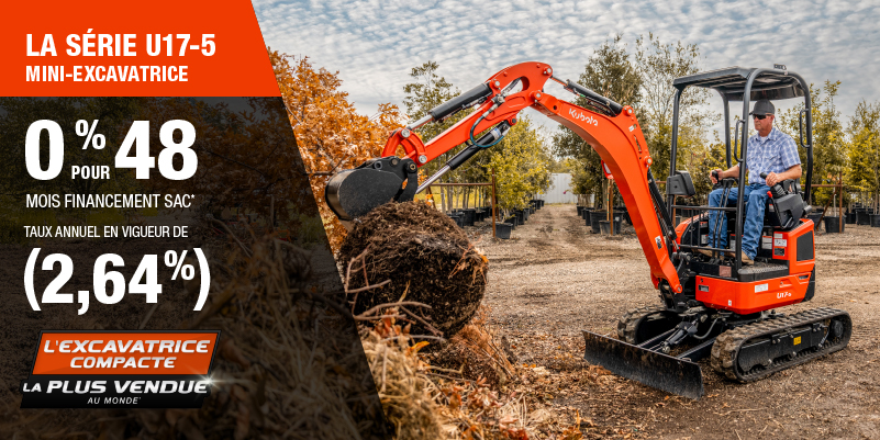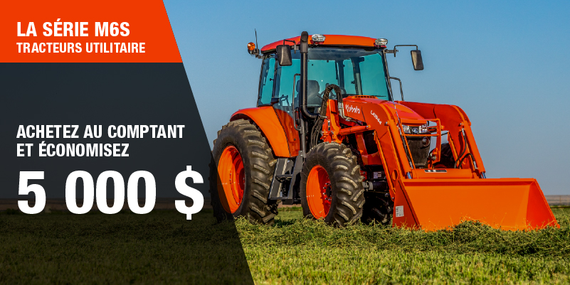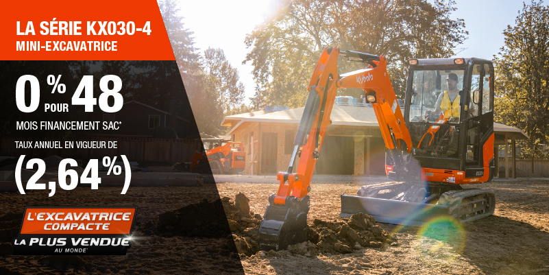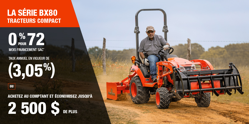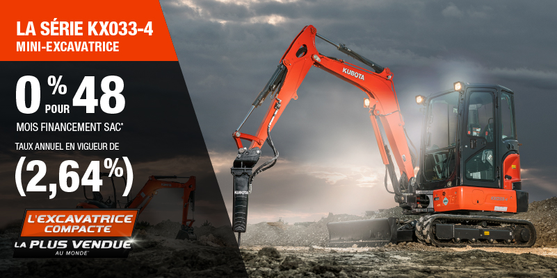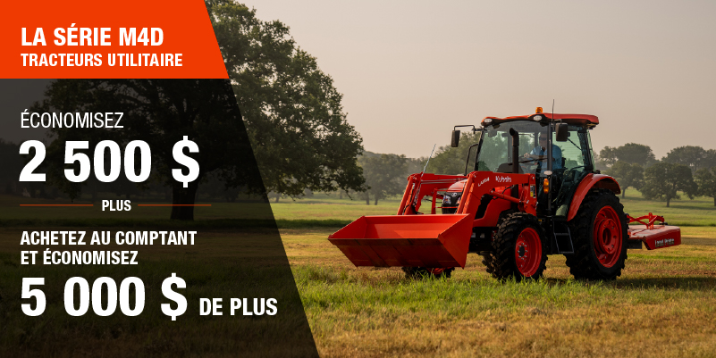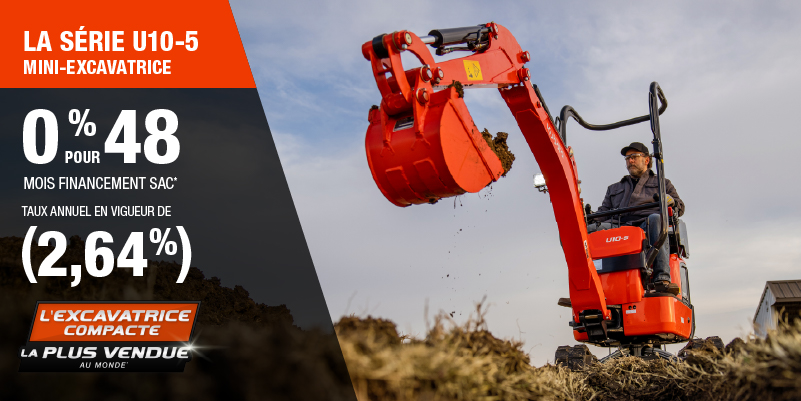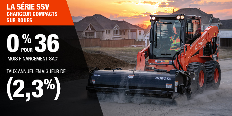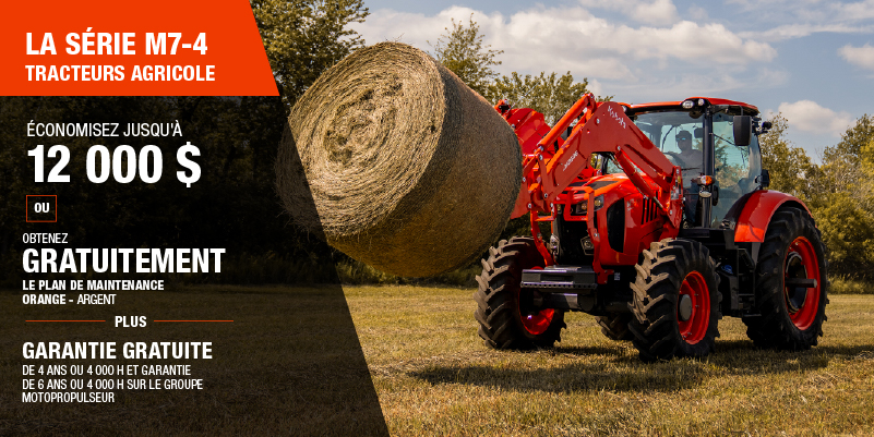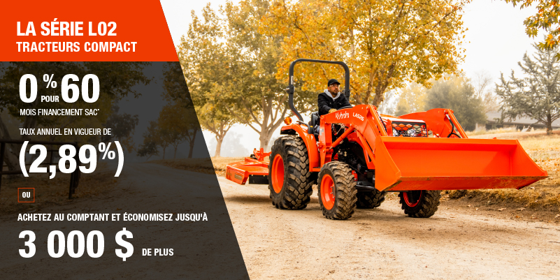 Un acompte initial minimal de 10 % est exigé pour les offres de financement pour les produits agricoles ou pour la pelouse. Les spécifications, caractéristiques, illustrations et équipements présentés se basent sur les plus récents renseignements disponibles au moment de la publication. Certains modèles sont présentés avec des accessoires offerts en option à un coût additionnel. Bien que les descriptions soient réputées bonnes, leur exactitude ne peut être garantie. Nous nous réservons le droit de modifier en tout temps, sans avis ni obligation, les spécifications, accessoires, matériels, modèles, prix, paiements et autres renseignements. L’offre est valide jusqu’au 12 janvier 2026. Consultez votre concessionnaire Kubota participant ou le www.kubota.ca pour obtenir tous les détails.