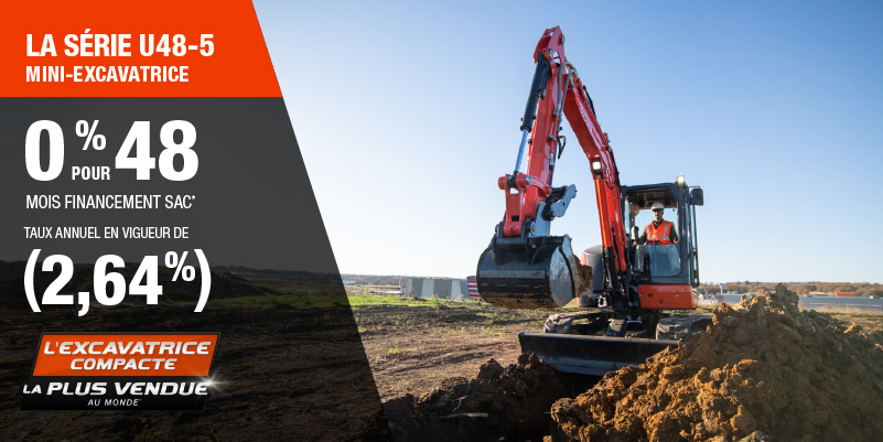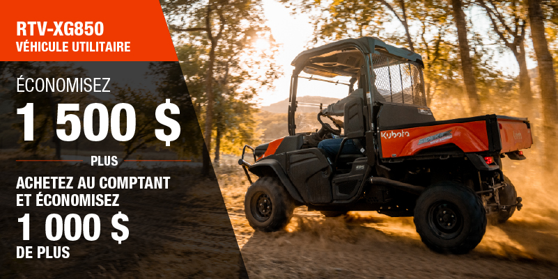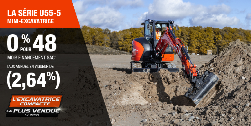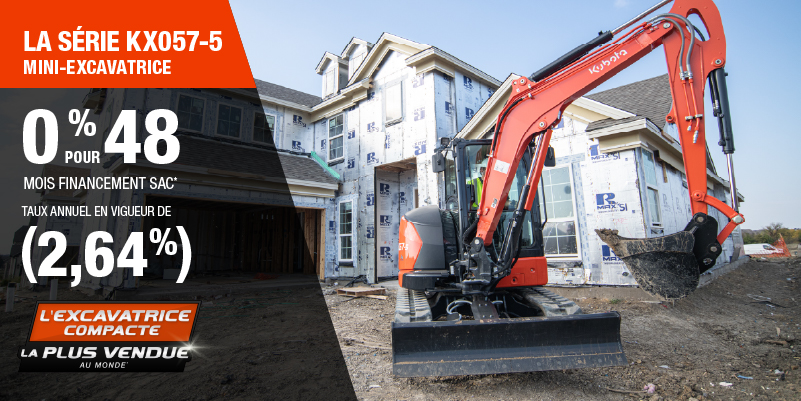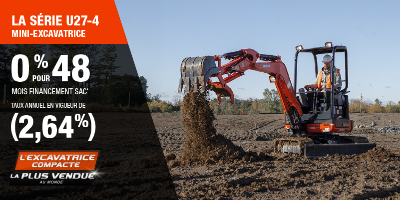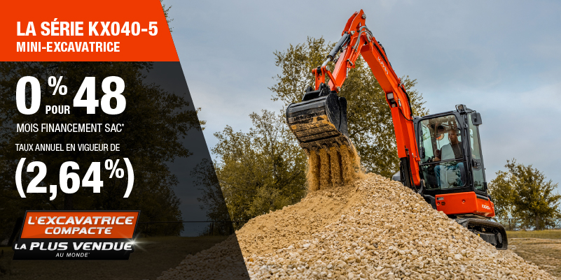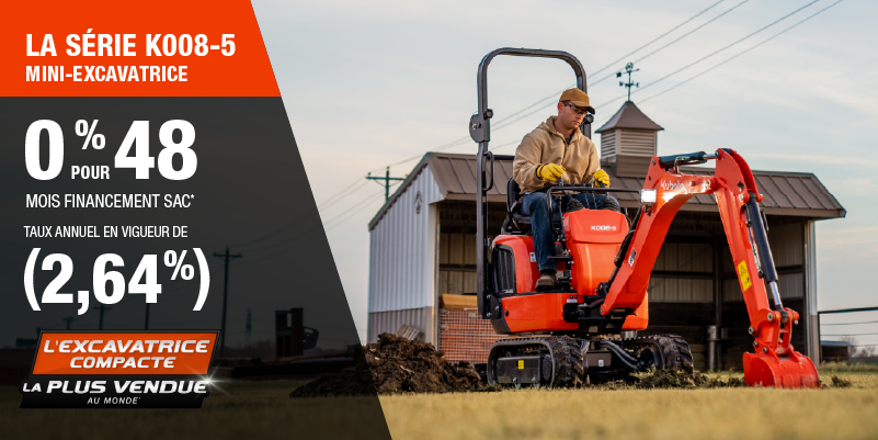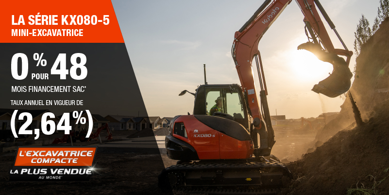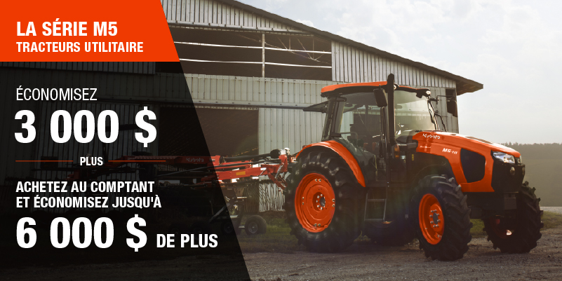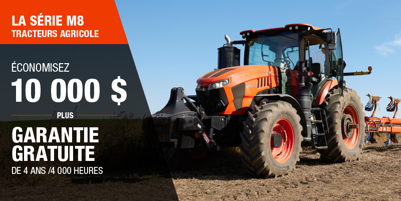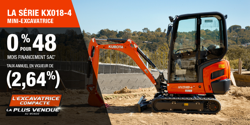 Un acompte initial minimal de 10 % est exigé pour les offres de financement pour les produits agricoles ou pour la pelouse. Les spécifications, caractéristiques, illustrations et équipements présentés se basent sur les plus récents renseignements disponibles au moment de la publication. Certains modèles sont présentés avec des accessoires offerts en option à un coût additionnel. Bien que les descriptions soient réputées bonnes, leur exactitude ne peut être garantie. Nous nous réservons le droit de modifier en tout temps, sans avis ni obligation, les spécifications, accessoires, matériels, modèles, prix, paiements et autres renseignements. L’offre est valide jusqu’au 12 janvier 2026. Consultez votre concessionnaire Kubota participant ou le www.kubota.ca pour obtenir tous les détails.